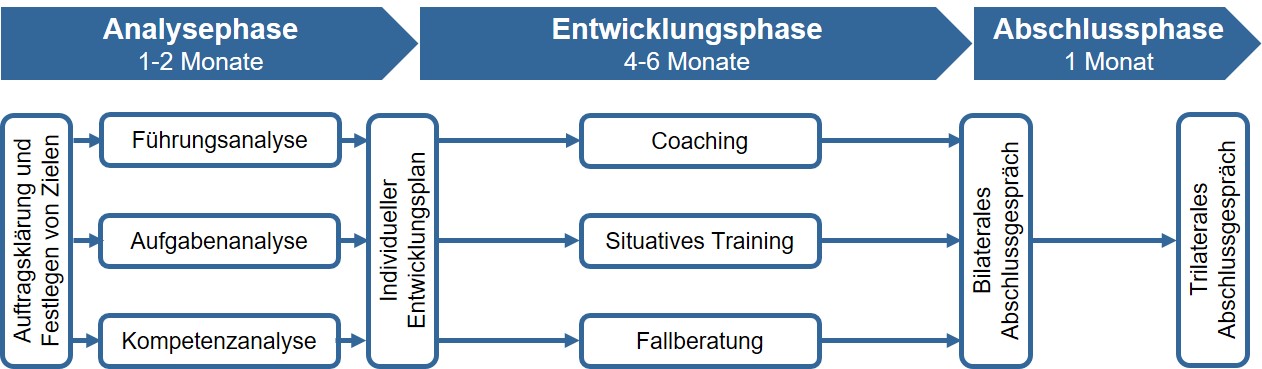 Der hier beschriebene Prozess der individuellen Entwicklung einer Führungskraft umfasst ca. sechs bis neun Monate.